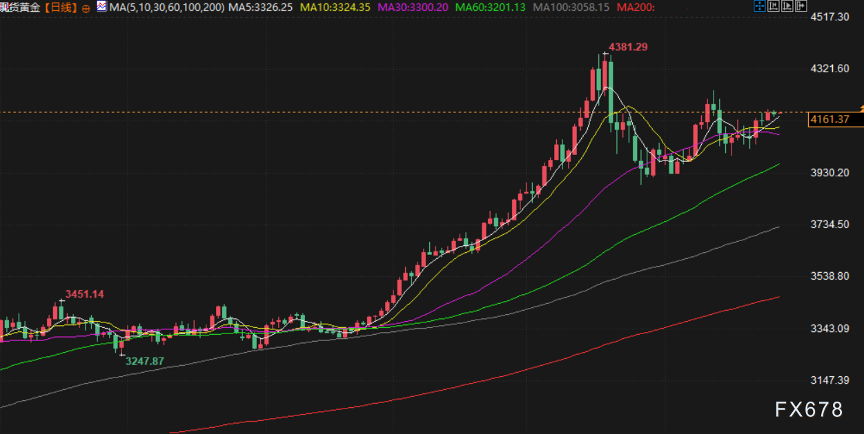 现货黄金周四小幅走低,从上一交易日创下的近两周高点回落。现货黄金下跌近0.16%,报收4157.22美元/盎司;瑞士宝盛分析师Carsten Menke表示:"我们仍预计10月回调所开启的盘整将继续,这次回调尚未完全结束。"自10月20日触及4381.21美元的历史高点以来,金价已回调约5%,但仍维持在每盎司4000美元的关键水平上方。