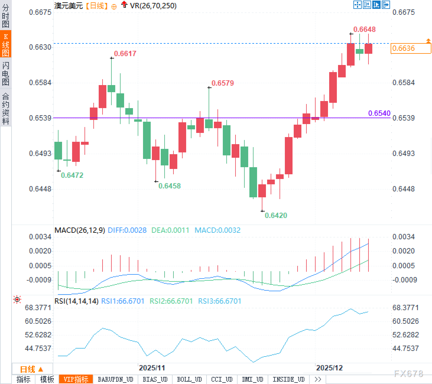 澳元兑美元在澳洲联储决议公布后经历了典型的“先跌后涨”行情。最初,由于政策声明初稿未立即排除降息选项,部分程序化交易与短线资金选择获利了结,推动汇价短线下探至0.6610一线。但随着澳洲联储主席在发布会上清晰传达“无近端降息空间”且不排除加息的立场,市场迅速修正定价,澳元兑美元反弹至0.6650附近。
