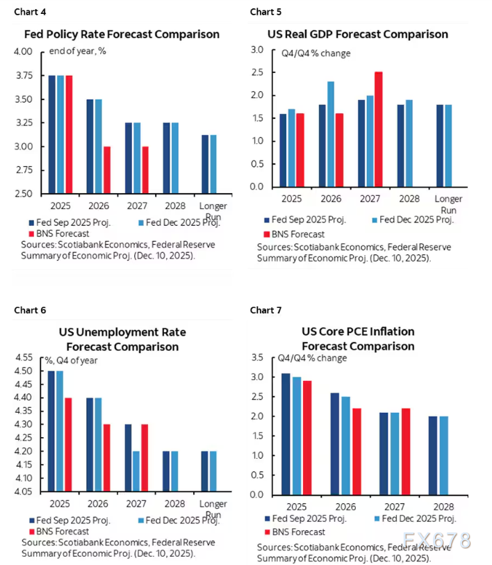 - 核心PCE通胀:2025、2026年各下调0.1个点至3.0%、2.5%,2027-2028年不变