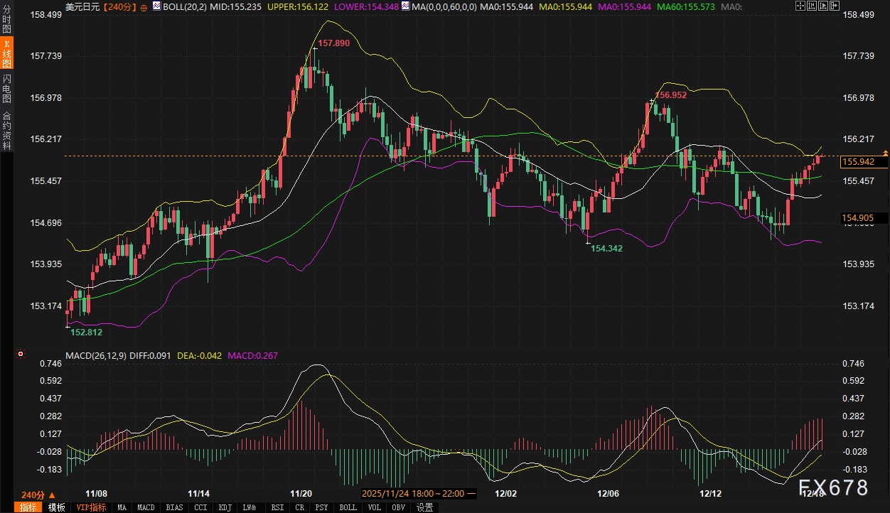 从技术面审视,美元兑日元240分钟图呈现高位震荡格局。当前汇率155.942紧贴布林带上轨(156.122)运行,显示短期仍属强势,但MACD指标中DIFF线(0.091)虽上穿DEA线(-0.042),金叉初成,但动能柱绝对数值不大,表明上涨动能并非十分强劲。布林带中轨155.235是近期的多空分水岭与首要支撑位,下轨154.348则是更关键的支撑区域。上方阻力首先关注156.10-156.30区间,该区域既是布林带上轨所在,也接近近期高点,突破难度较大。若日本央行表态意外鹰派,推动日元走强,汇率可能向下测试155.00-154.80支撑带。交易者盘中需密切关注日本央行决议公布瞬间的波动率放大情况,以及汇价对上述关键技术区间的反应。