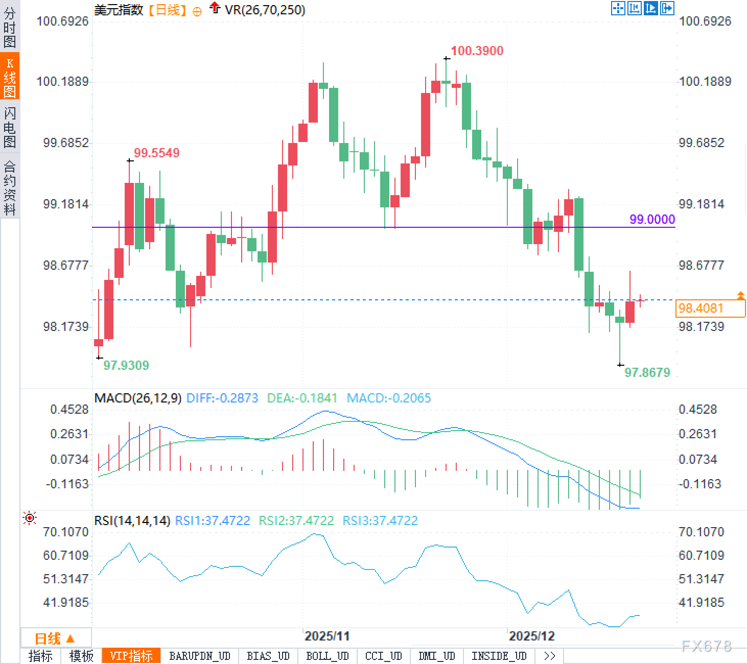美元指数当前交投98.40附近,日线图上已明显运行在99下方。前期99附近更像是一个市场记忆较强的分水岭:当价格在其上方时,回撤更容易被视为整理;而跌破后,99区域往往转为潜在阻力带,反弹若在此受阻,市场会更倾向把它理解为趋势延续而非简单修复。图形上,阶段高点约在100.3900,随后出现一段较为连贯的回落,低位一度触及97.8679附近。