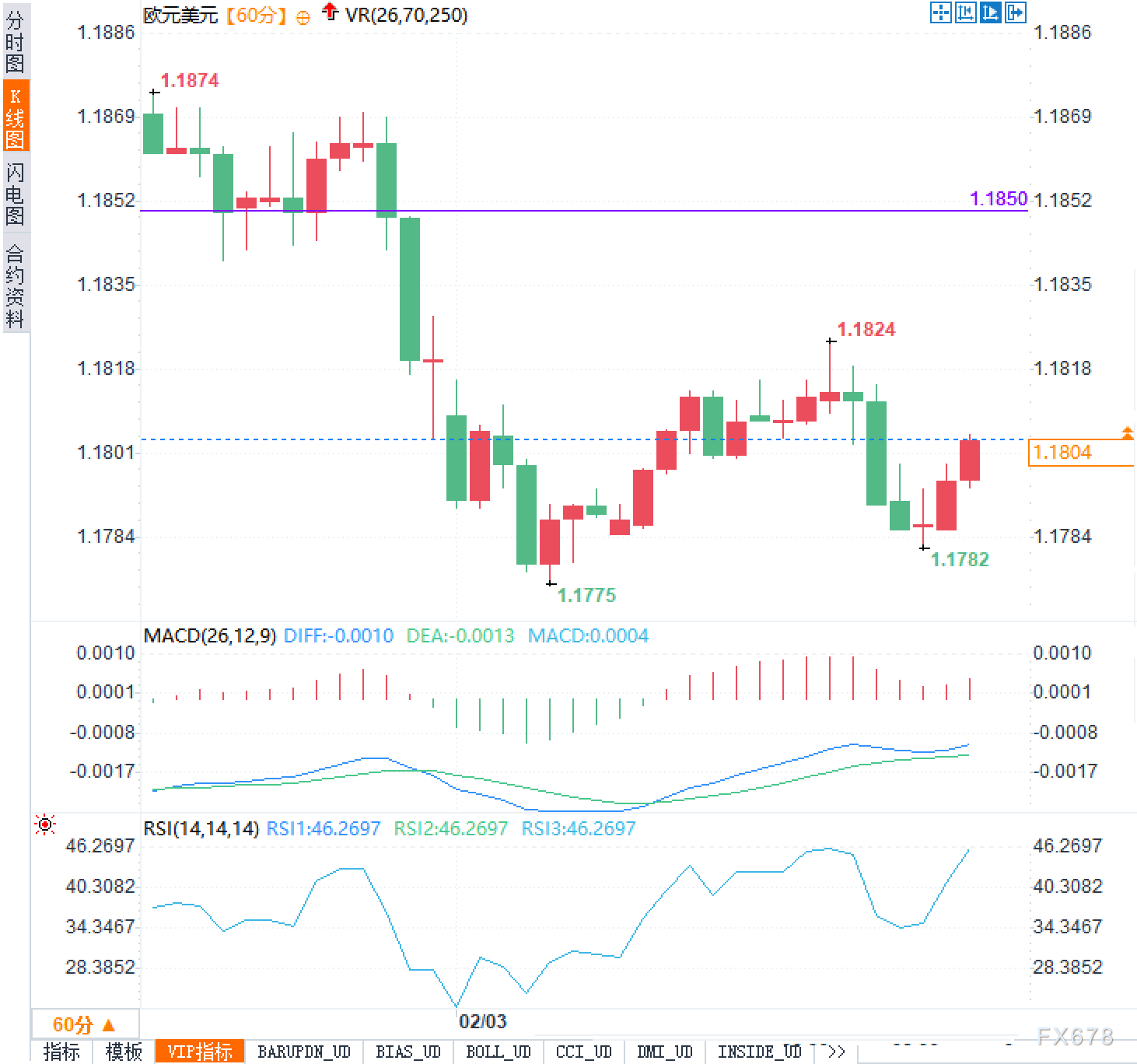 指标方面同样透露出胶着信号。MACD显示DIFF为-0.0010,DEA为-0.0013,柱状图虽小幅回升至0.0004,但仍处于零轴下方,说明空头仍占主导,但下行动能已有所减弱。RSI读数为46.2697,处于中性偏弱区间,既未进入超卖也未显现明显买盘力量,意味着价格走向高度依赖外部催化。只有当RSI稳定站上50,并伴随价格突破1.1824,才能确认短线趋势转向;反之,若RSI再度下探且汇价跌破1.1782,则需警惕新一轮跌势开启。