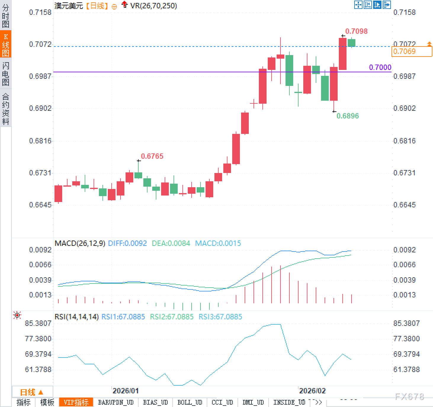 汇通财经APP讯——2月10日周二,澳元兑美元北美时段在0.7070附近震荡交投,距离近期高点0.7100仅一步之遥。虽然汇价一度尝试突破该位置,但未能站稳便小幅回落,显示出上方压力明显。从日线结构来看,整体仍处于上行通道中的高位整理阶段,市场情绪偏向谨慎。当前走势的核心驱动力来自两大主线:一方面是澳洲联储开启紧缩周期带来的利差优势支撑,另一方面则是美联储政策转向预期随美国经济数据波动而摇摆不定,对美元形成阶段性压制。